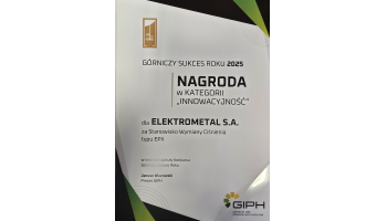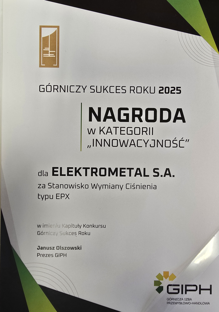 Niezmiernie miło nam poinformować, iż nasza firma zdobyła nagrodę w kategorii "INNOWACYJNOŚĆ" w konkursie "GÓRNICZY SUKCES ROKU" za stanowisko wymiany ciśnienia typu EPX. Konkurs organizowany był przez Górniczą Izę Przemysłowo - Handlową.